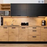 この海辺のアパ-トメントには,電子レンジ,電気ポットと冷蔵庫を備えた器具でいっぱいの台所が含まれています.
